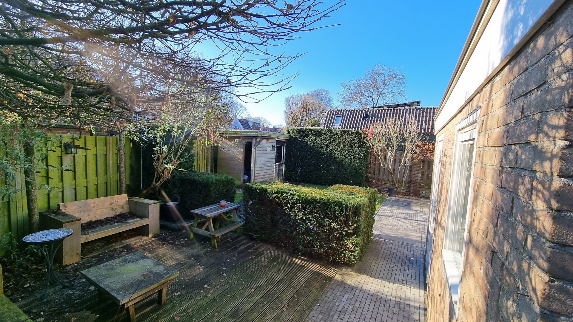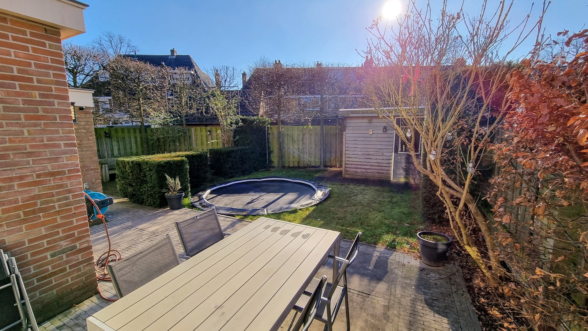 Tuin: voortuin, zijtuin met oprit en laadpaal. Achtertuin met houten berging, trampoline en twee terrassen.