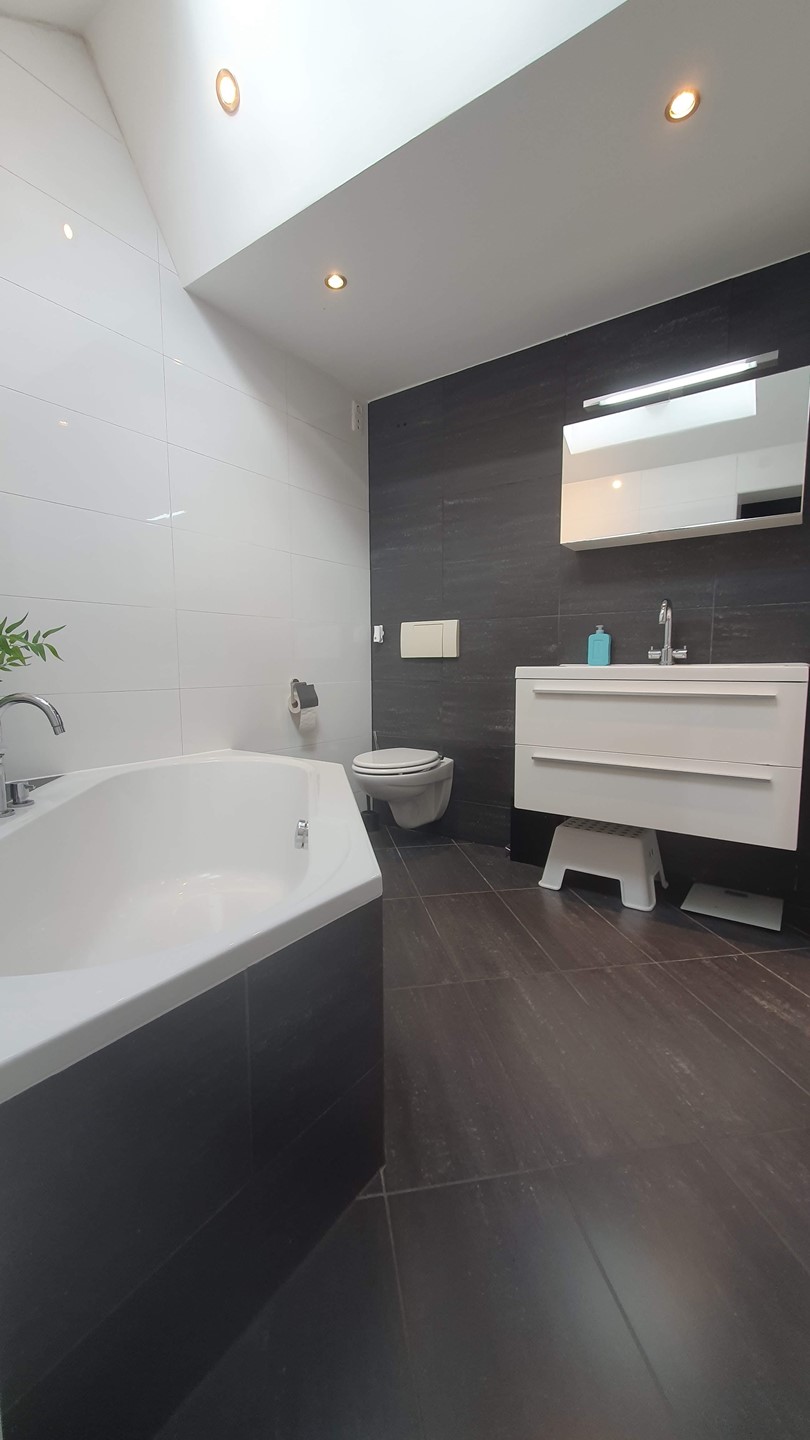 1e verdieping: overloop, aansluiting voor wasmachine en droger, 4 slaapkamers en een ruime badkamer met wastafel, inloopdouche, ligbad, toilet en 2 dakramen.